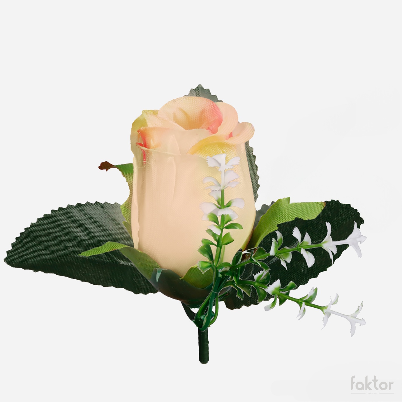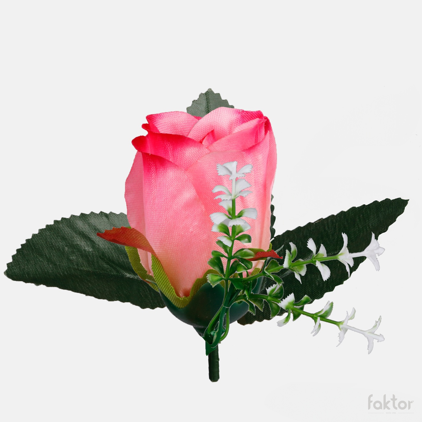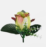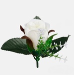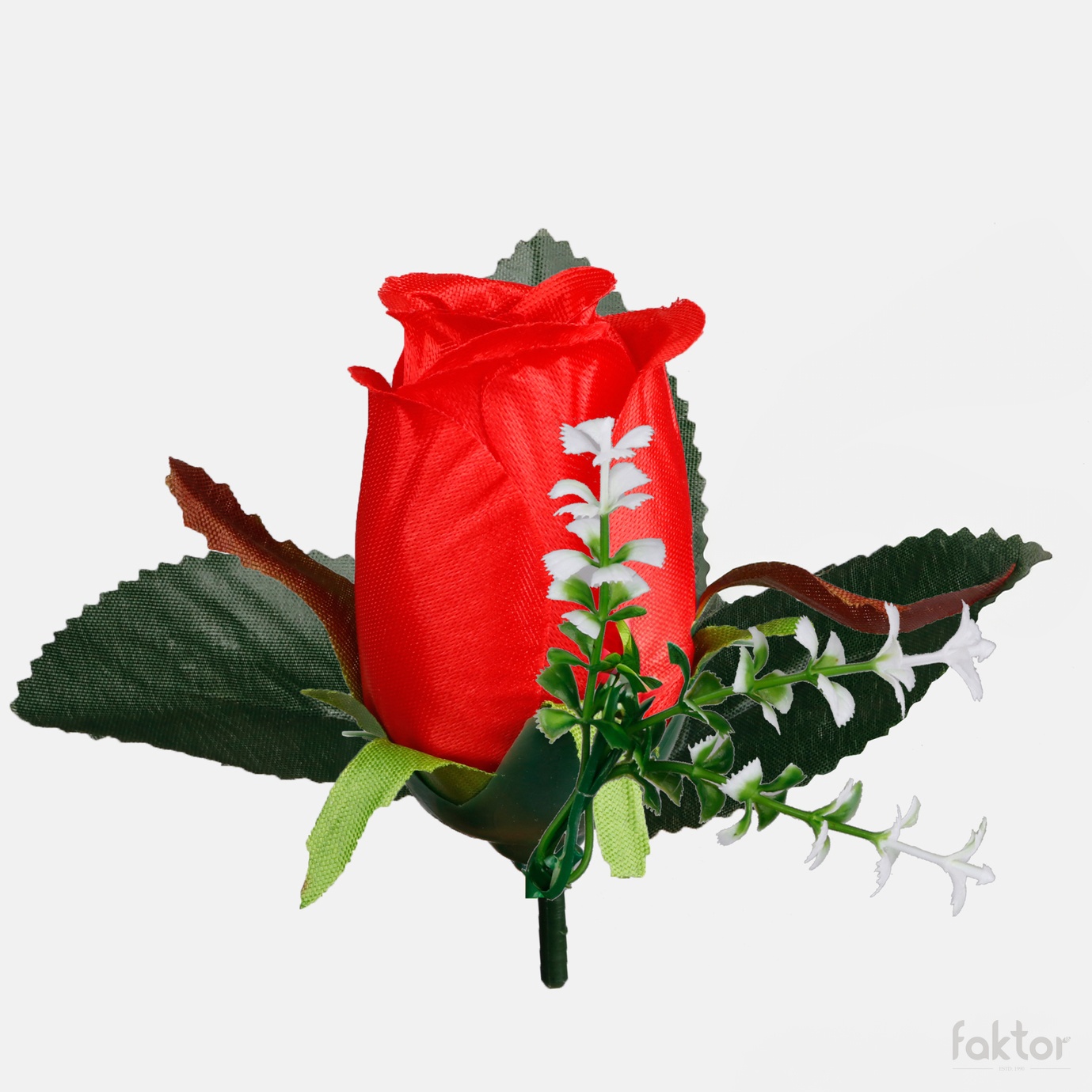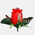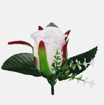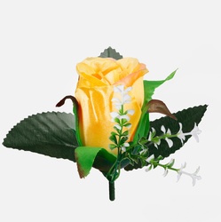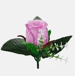 Sztuczna główka wyrobowa róży W238 w pąku z dekoracyjną gałązką gipsówki i listkami pasuje do samodzielnego skomponowania niemal każdej ozdoby florystycznej. Dostępna w ciekawych kolorach.