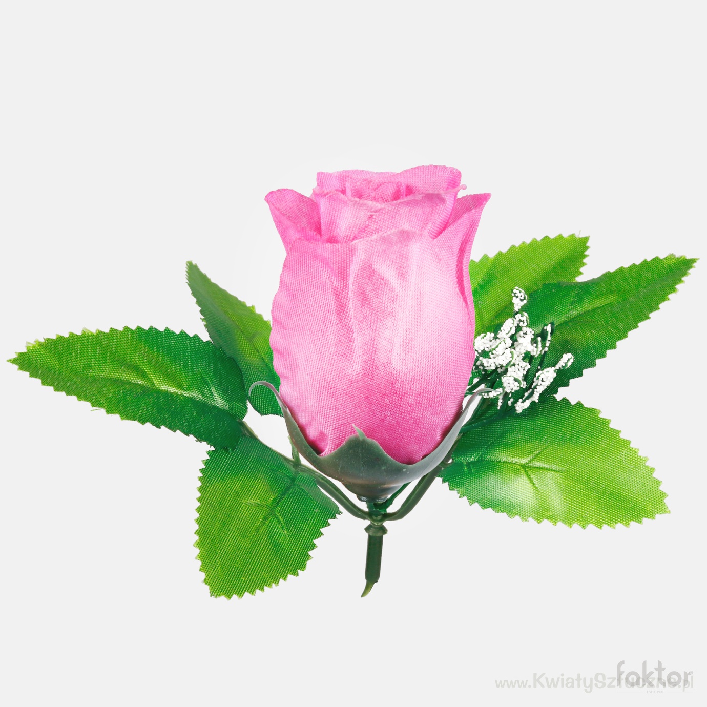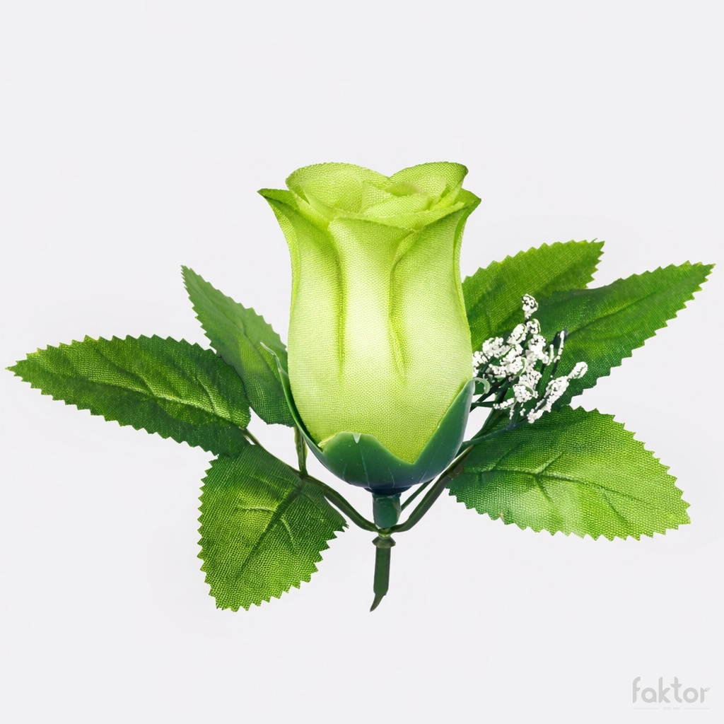 Główka róży w pąku z dodatkiem listków, ozdobiona gipsówką. Występuje w wielu kolorach, oraz dwutonowych odcieniach.