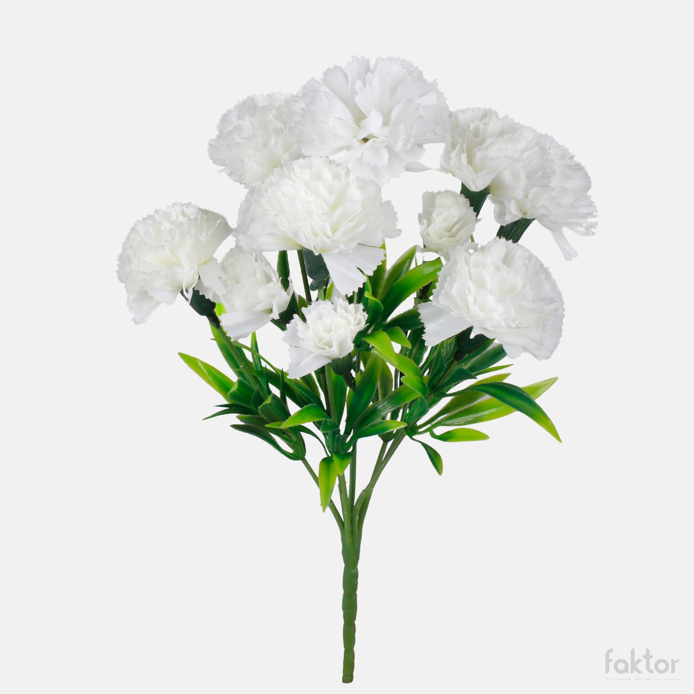 Mały bukiecik goździków składający się z siedniu rozwiniętych kwiatków, oraz trzech pączków. Posiada listki wykonane z miękkiego plastiku, w dwutonowym kolorze zieleni.