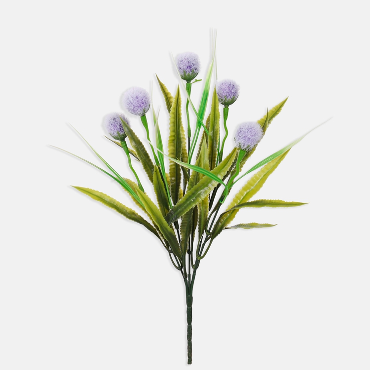 Niewielki bukiet dekoracyjny QA276K z pięcioma puszystymi kulkami, trawą i wąskimi listkami. Sprzedawany w kilku radosnych kolorach pasujących do wielu aranżacji okolicznościowych.