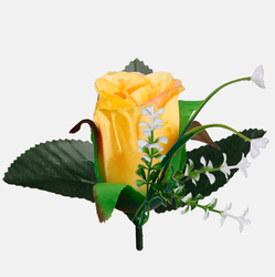 Sztuczna główka wyrobowa róży W238 w pąku z dekoracyjną gałązką gipsówki i listkami pasuje do samodzielnego skomponowania niemal każdej ozdoby florystycznej. Dostępna w ciekawych kolorach.