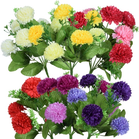 Sztuczne bukiety chryzantem mają najczęściej kilka, do kilkunastu główek kwiatowych. Najpopularniejsze kolory w jakich występują to żółty, pomarańczowy, czerwony, fioletowy.