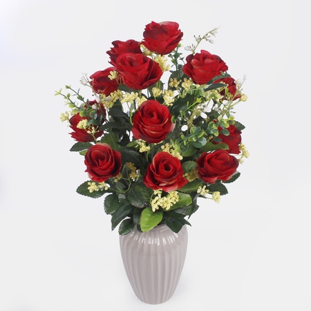 Bujny bukiet osiemnastu róż w pąkach. Ozdobiony gałązkami gipsówki, oraz eukaliptusa. Sprzedawany w komplecie czterech kolorów.
