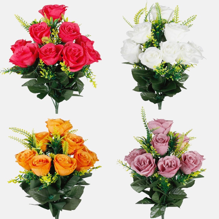 Róża x 12 to naturalnych rozmiarów pęk czerwonych róż, przyozdobionych drobnymi gałązkami w dwóch odcieniach zieleni. Bukiet cechuje idealne odwzorowanie kolorów i tekstury, dzięki czemu w dotyku przypomina rzeczywiste rośliny i jest doskonałą alternatywą dla świeżych kwiatów. Klasycznie piękne Róże x 12 idealnie pasują do wysokich wazonów, mebli w jasnych i pastelowych odcieniach, flory zielonej. Sprawdzą się także jako część większych kompozycji, z użyciem szklanych flakonów lub gąbki florystycznej. Wystarczy skrócić łodygę, liście i płatki posypać opalizującym brokatem bądź przeszyć cekinami, a powstała dekoracja ozdobi każde wnętrze.