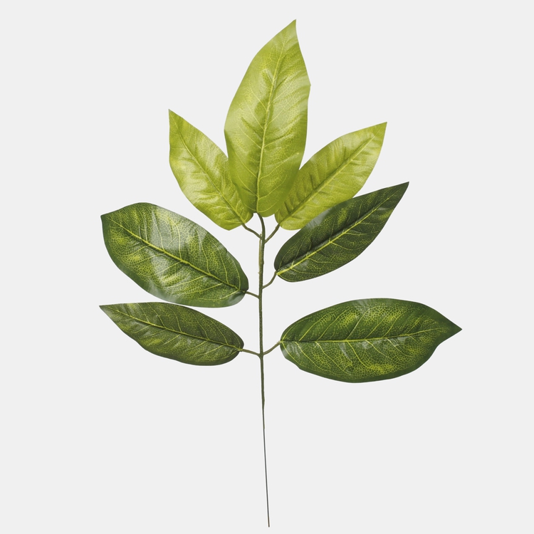 Na wysokiej gałązce jest siedem liści krotona w kilku odcieniach zieleni.Długość gałązki wynosi 56 centymetrów — z takich gałązek można stworzyć efektowny bukiet, wplatając w niego listki innych roślin lub kwiaty. Ustawienie takiej wiązanki w wazonie pozwoli wykreować wyjątkową dekorację do domu. Liście można układać także bez żadnych dodatków, tworząc z nich np. efektowną kompozycję pod szklanym blatem ławy lub stołu. Możliwości jest naprawdę wiele. W jednym opakowaniu są 24 sztuki takich gałązek.