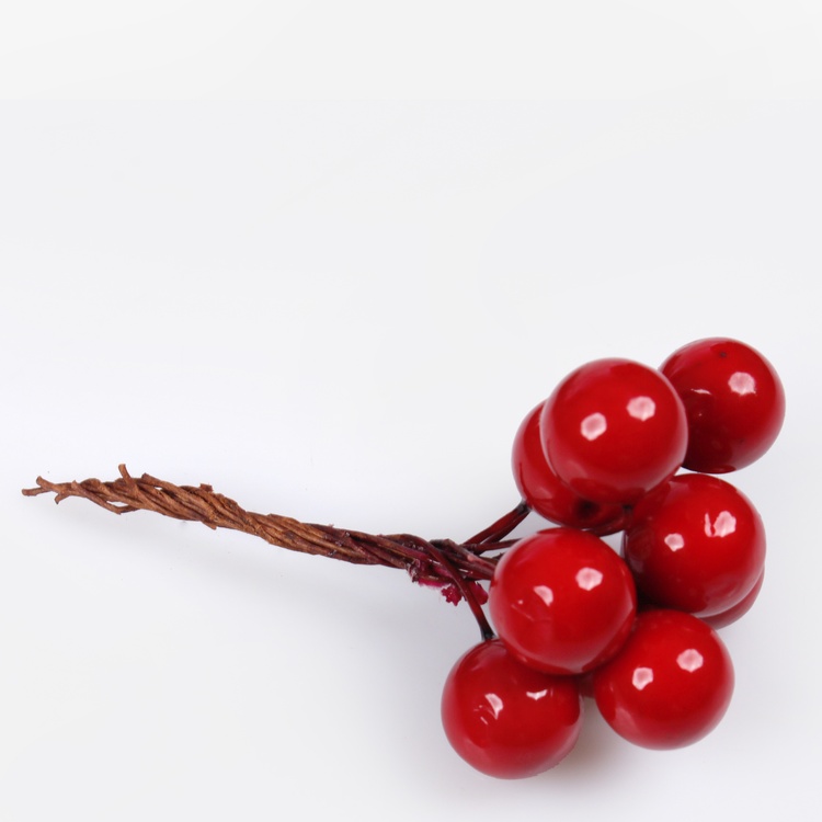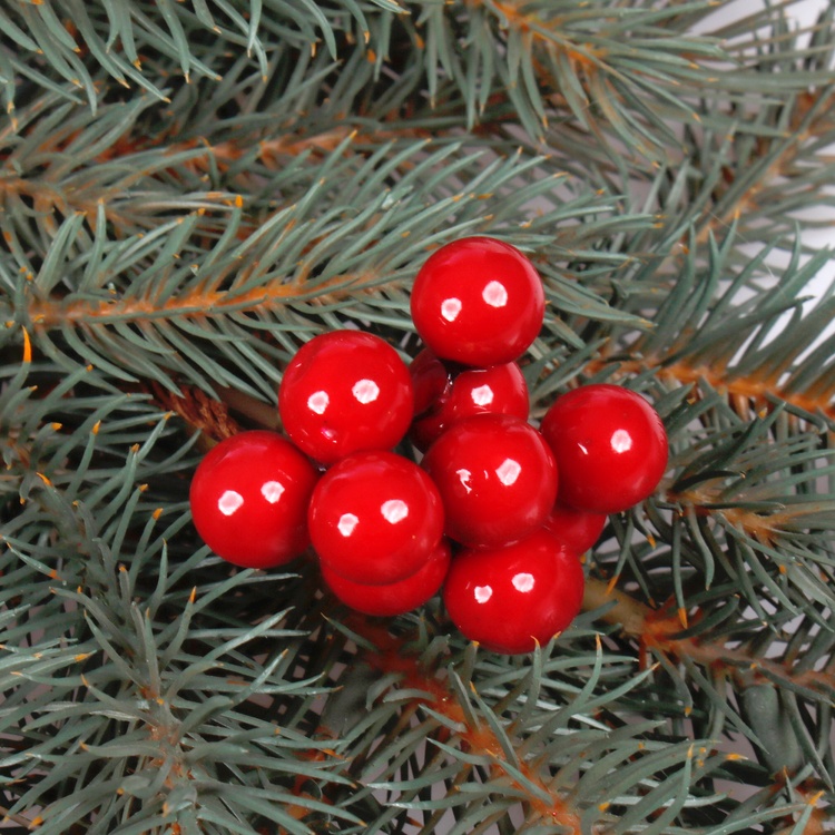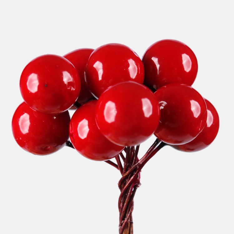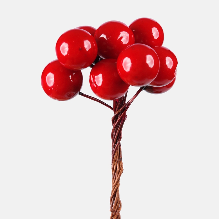 Małe, czerwone jagody na cienkich pięciocentymetrowych drucikach. Łączone w wiązki po 10 sztuk i zapakowane w torebeczkę po 12 wiązek. Z pewnością dodadzą uroku jesiennej i świątecznej kompozycji, czy dekoracji.